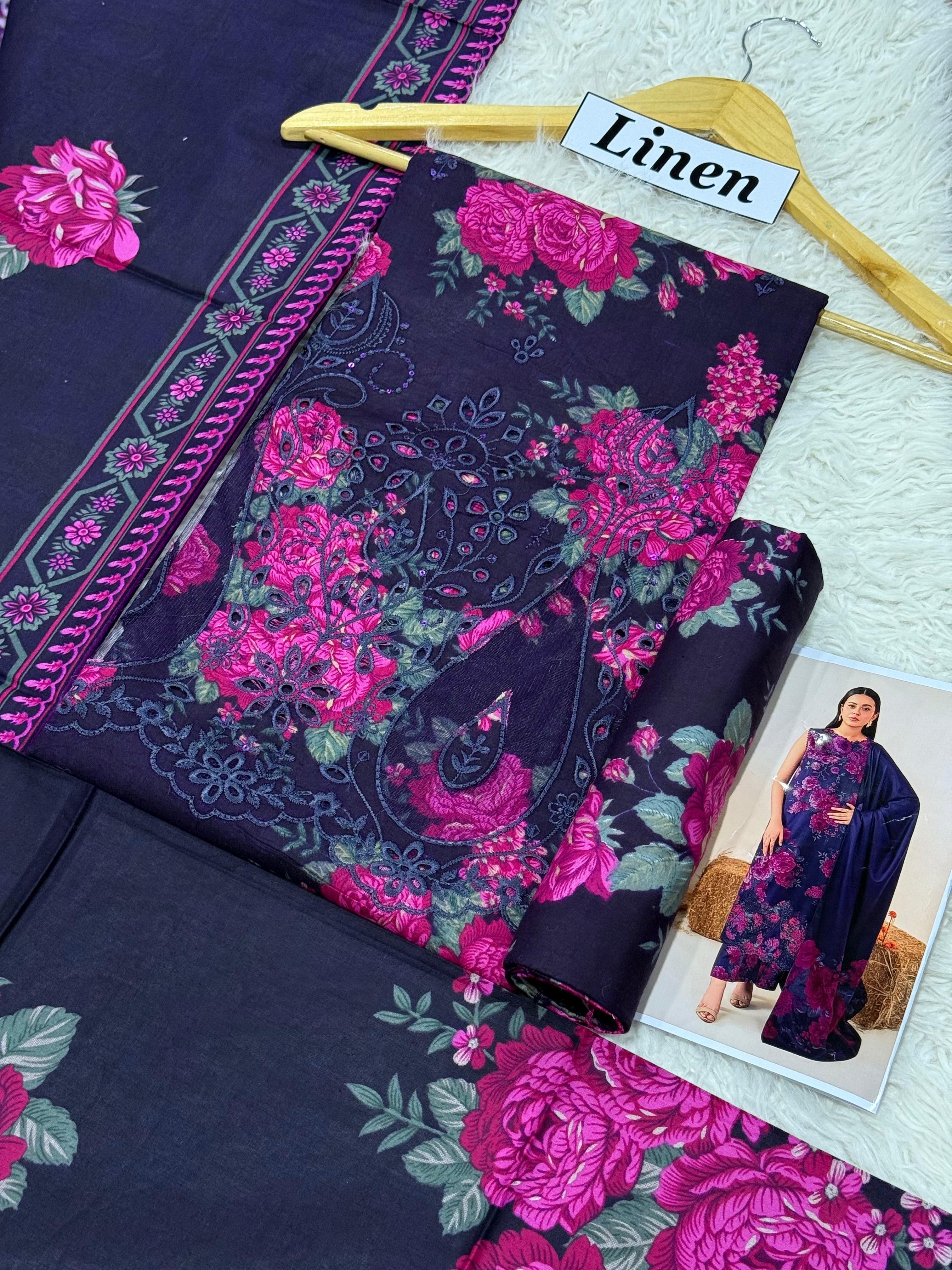 LINEN DIGITAL PRINT WITH DAMAN APPLIC WORK 3PC D26 – ZM Textile